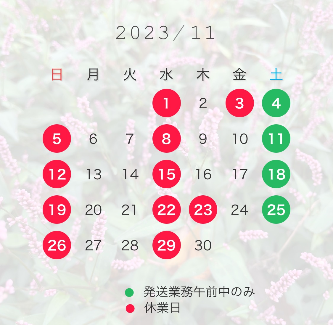 10月の営業カレンダーです。雲や吹いている風、虫の声などを聞きますとすっかり秋になったなぁと感じます。だんだんと気温も下がっていくのでしょうね。皆さま、体調などにはお気をつけてお過ごしください。